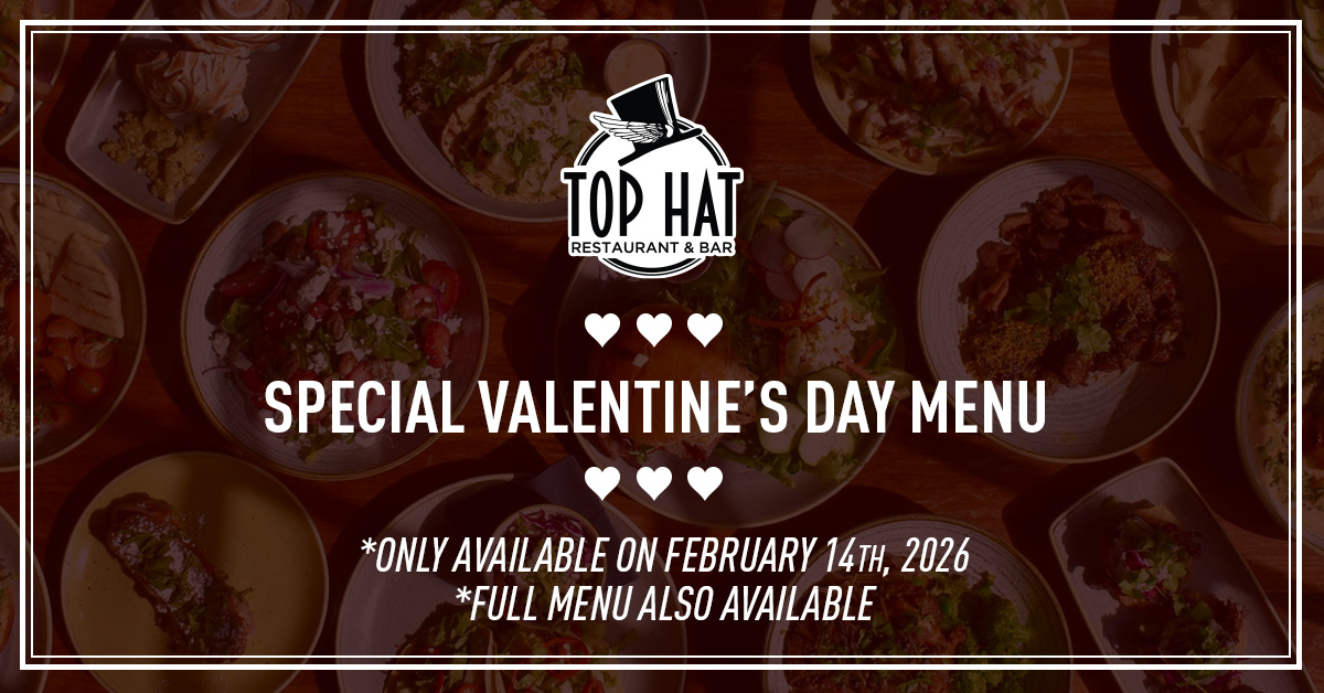 Celebrate Valentine’s Day with a delicious night out right here at the Top Hat! On Saturday, February 14, 2026, we’re offering a special Valentine’s Day menu (alongside our full regular menu) — perfect for date night, a cozy dinner with friends, or treating yourself to something special.
